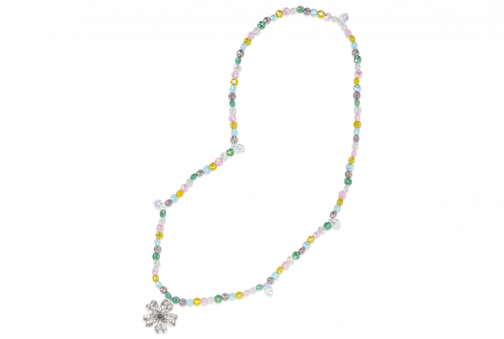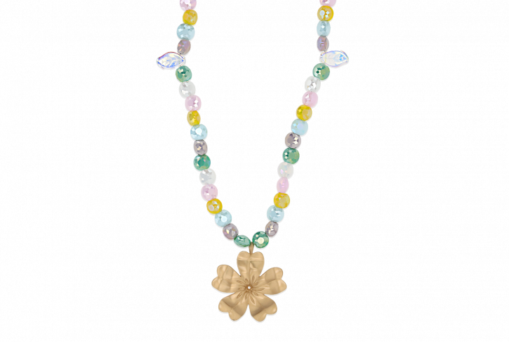 - Limited Edition Mardi Gras necklace featuring a Float Flower pendant with iridescent pastel multi-colored crystals.