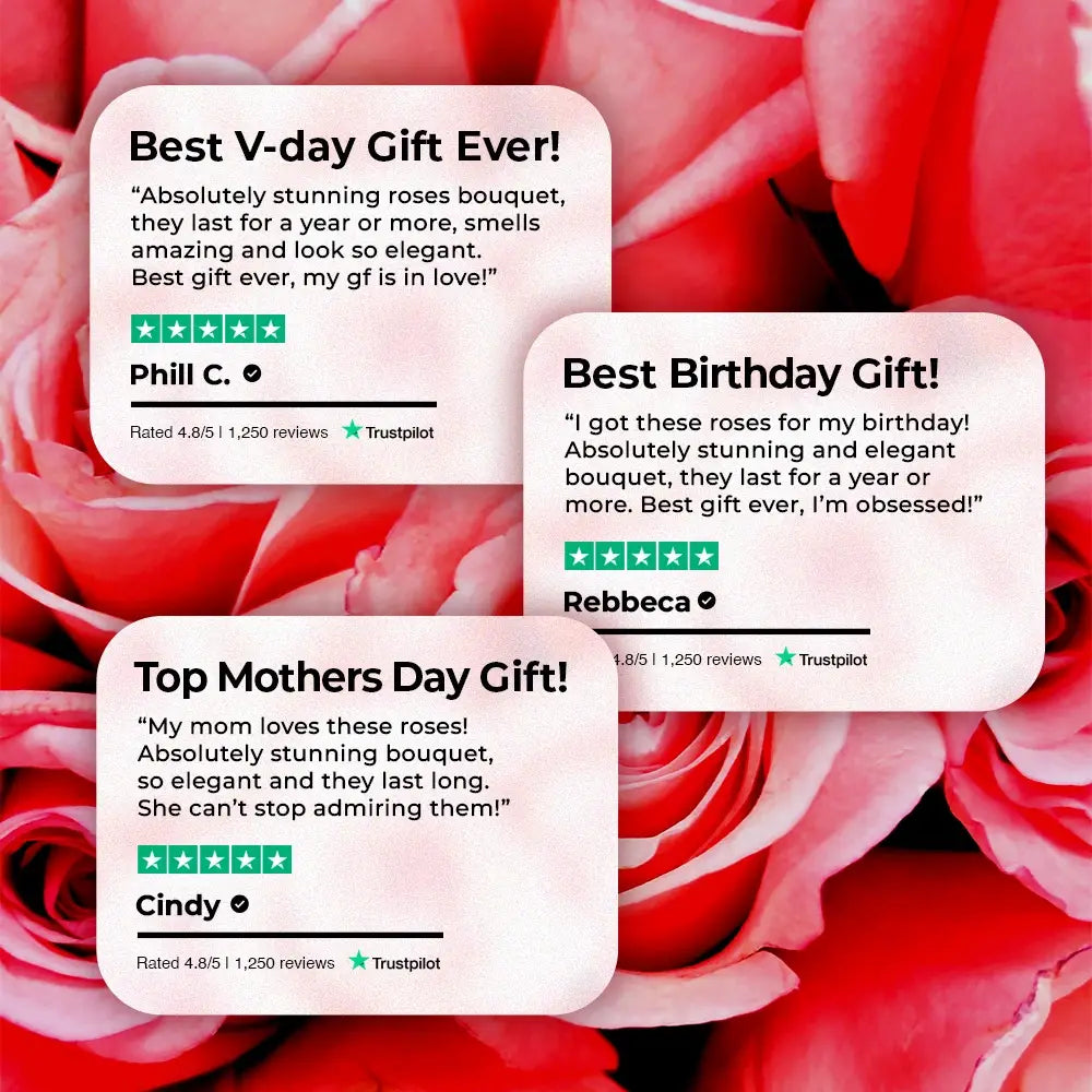 Each Rose Forever arrangement features the finest preserved roses, handpicked to maintain their vibrant beauty for over a year. These luxurious preserved flower arrangements are perfect for any occasion, including Valentine's Day, Mother's Day, Christmas, or graduations. Ideal for home decor, they bring timeless elegance and sophistication to any living space. With no need for watering or maintenance, these long-lasting roses provide hassle-free beauty. To keep them fresh, store in a cool, room-temperature environment, dust gently with a soft cloth, and avoid direct sunlight, watering, or contact with light-colored fabrics.
