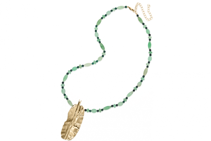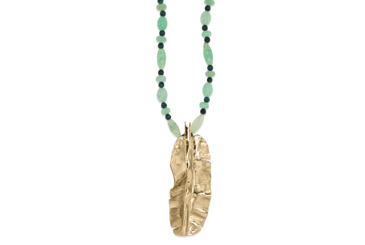 - Necklace with Aventurine and Malachite gemstones featuring a Banana Leaf Pendant