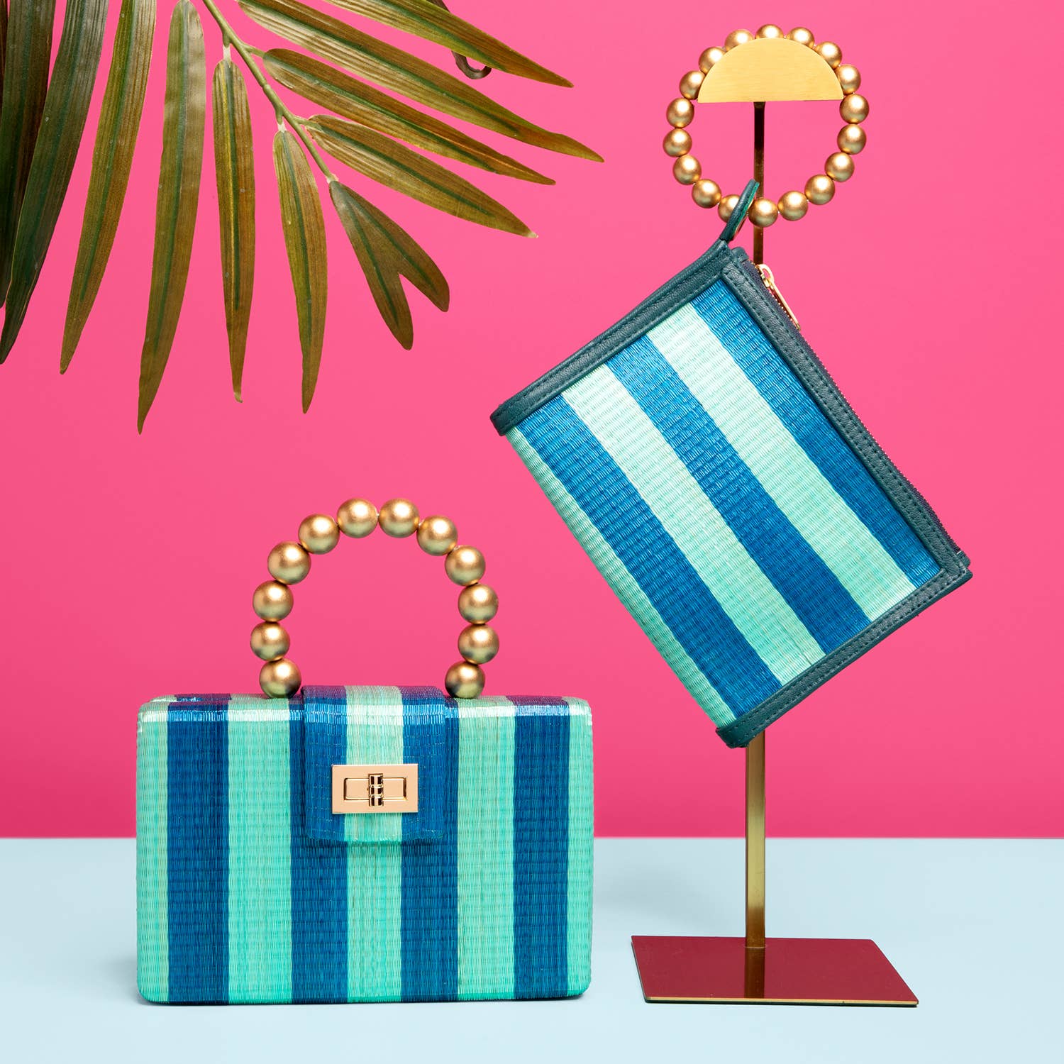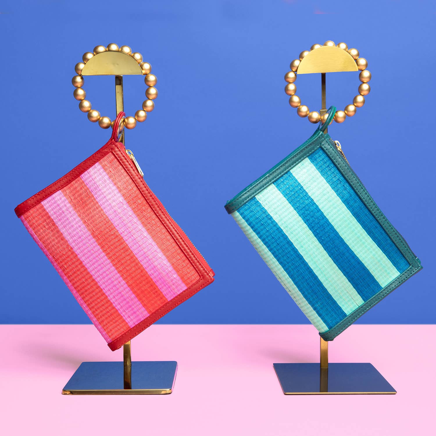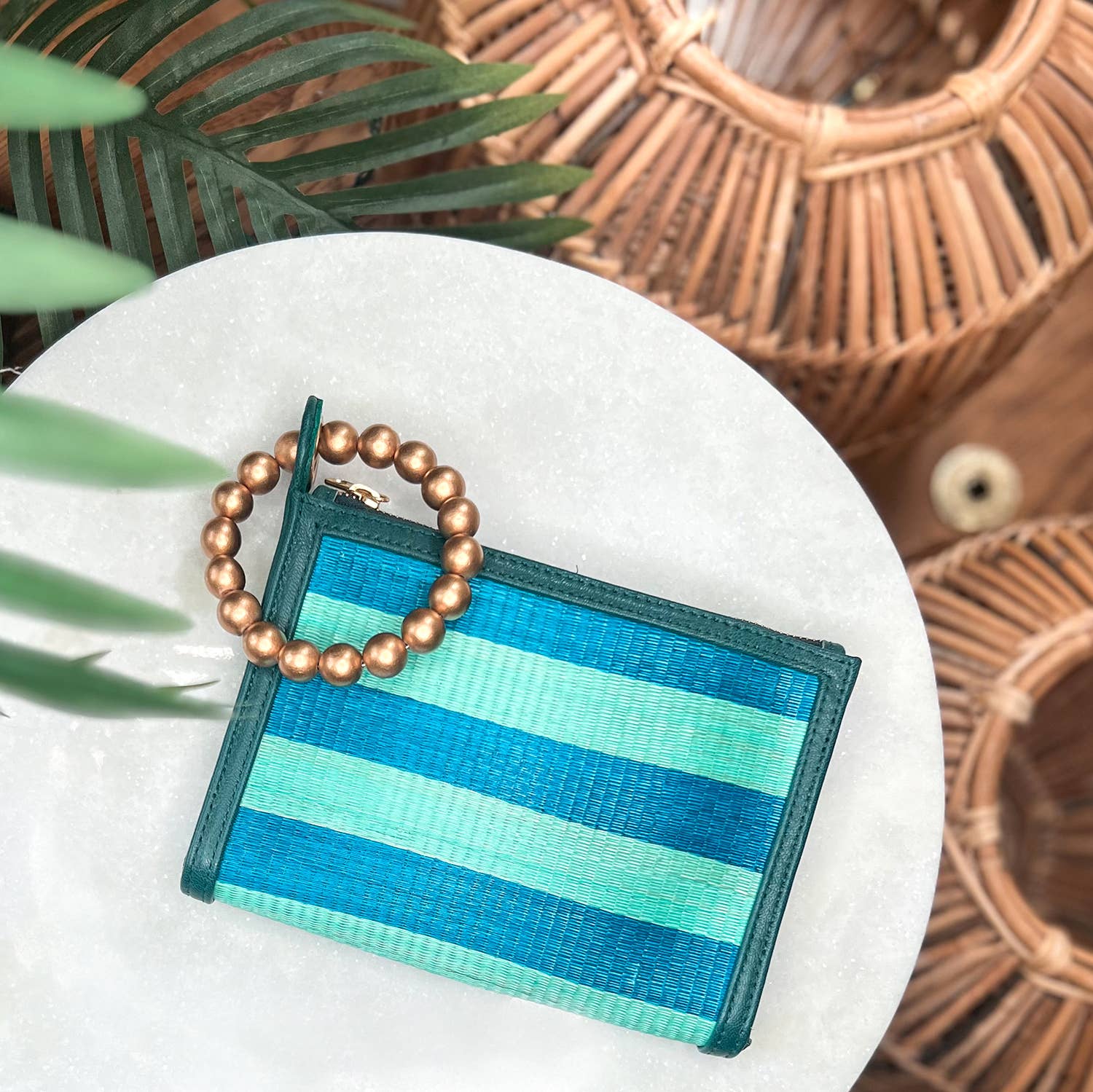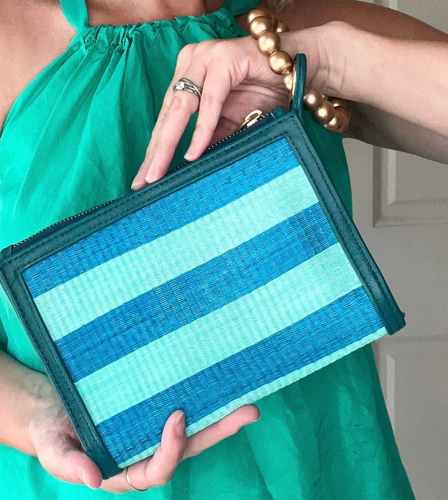Blue & Turquoise Stripe Woven Straw Wristlet Pouch | Summer