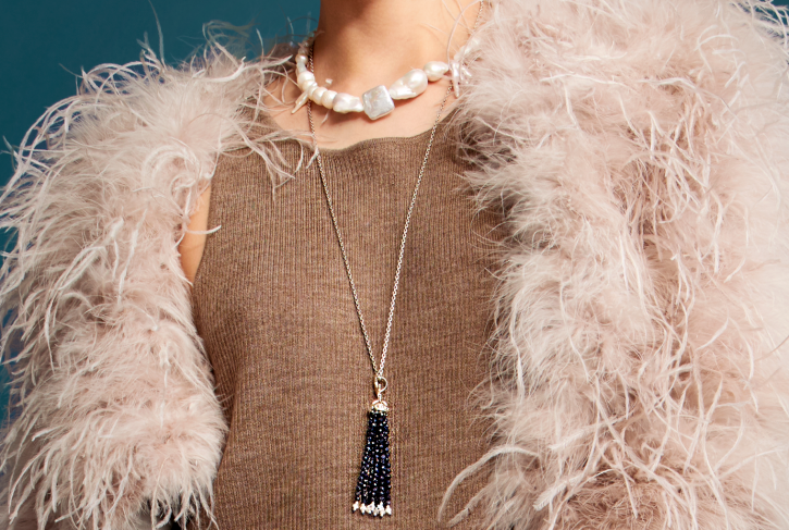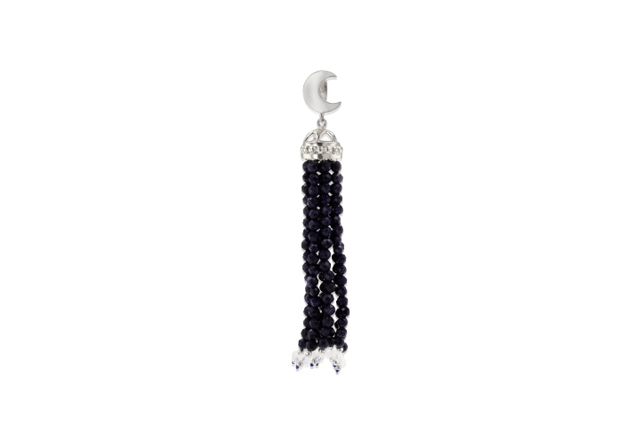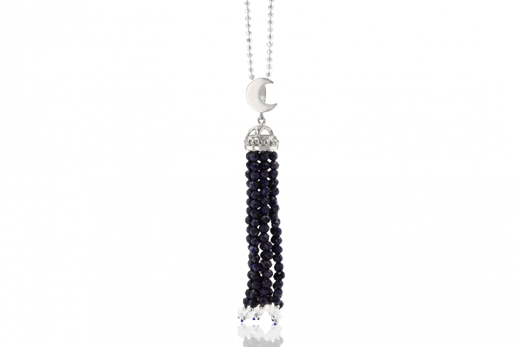 - Tassel Pendant with a crescent moon featuring tassels with faceted blue goldstone and faceted rainbow moonstone
