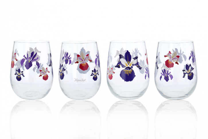 Stemless Wine Glasses from Mf. At Home featuring Iris flowers in various colors and sizes.