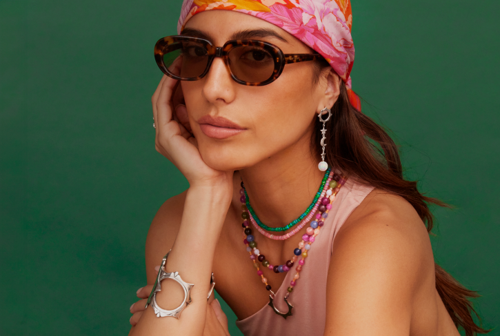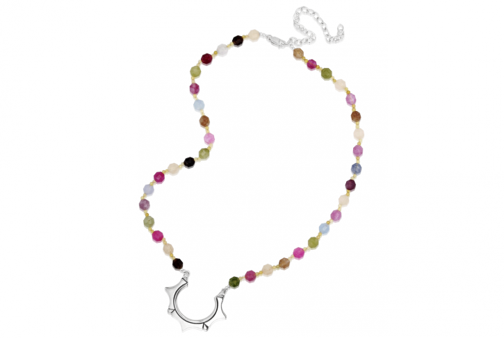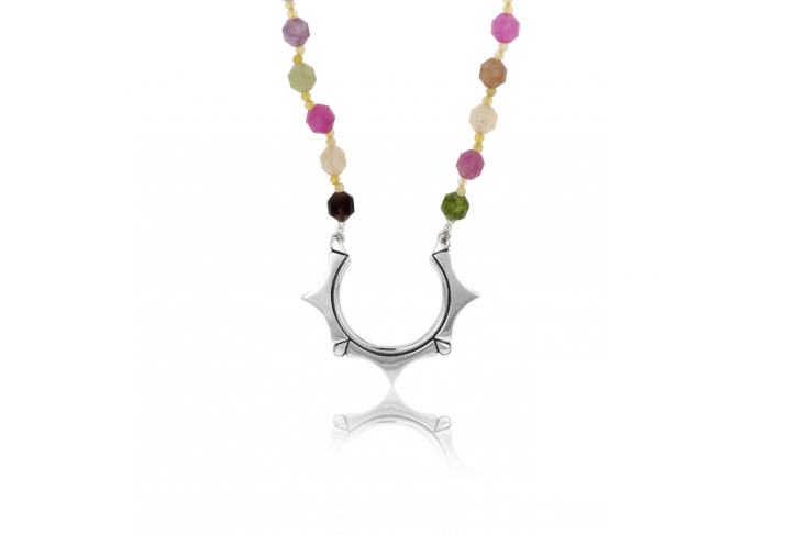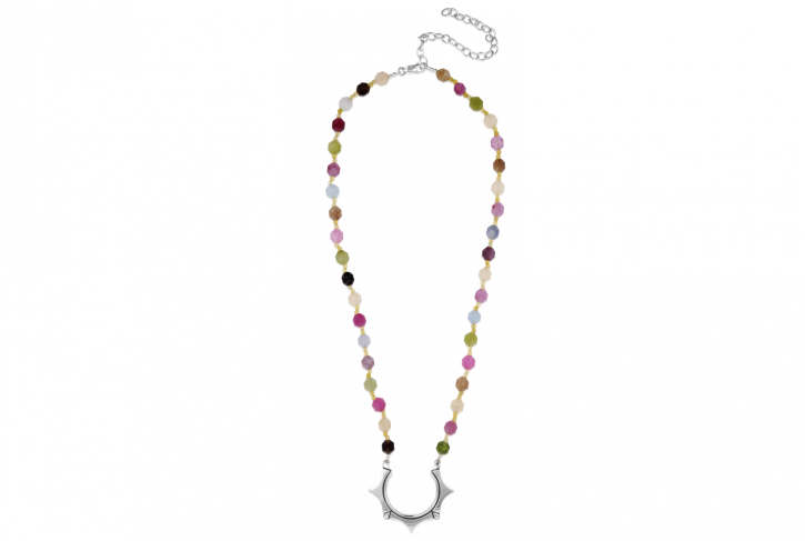- Multicolored gemstone necklace featuring a 3/4 Sun pendant. Each necklace is unique and no two are exactly alike.