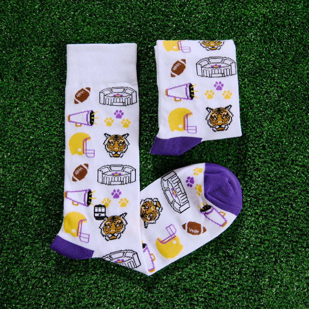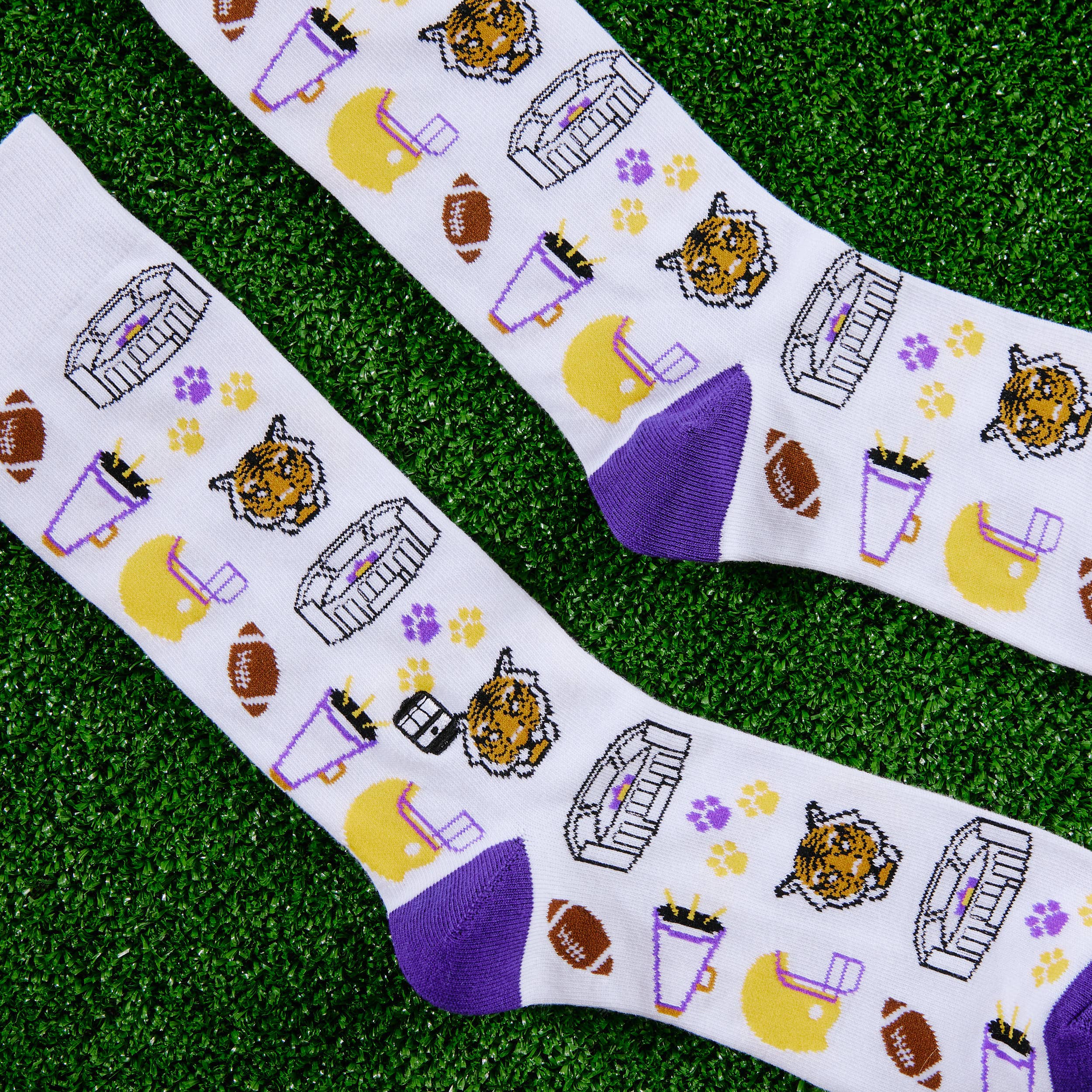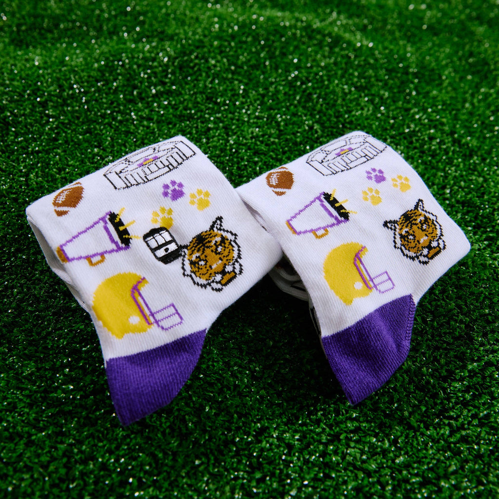 Tigers football socks featuring, megaphone, football, tiger, paw prints, helmet and stadium.